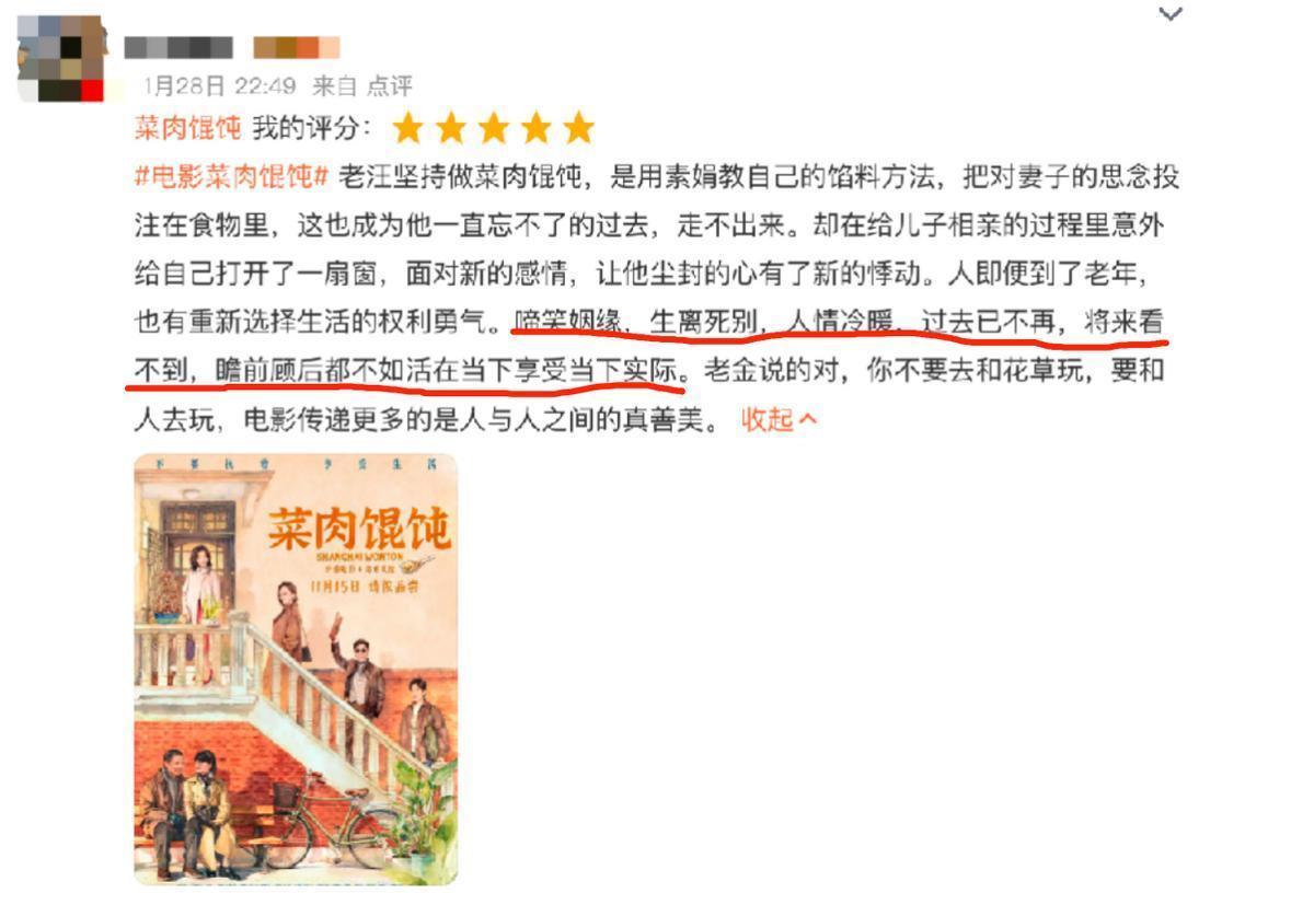 所以啊!如果你们家也是久没陪父母坐在影院里看电影了?听我的,真该带他们去看看这部《菜肉馄饨》!